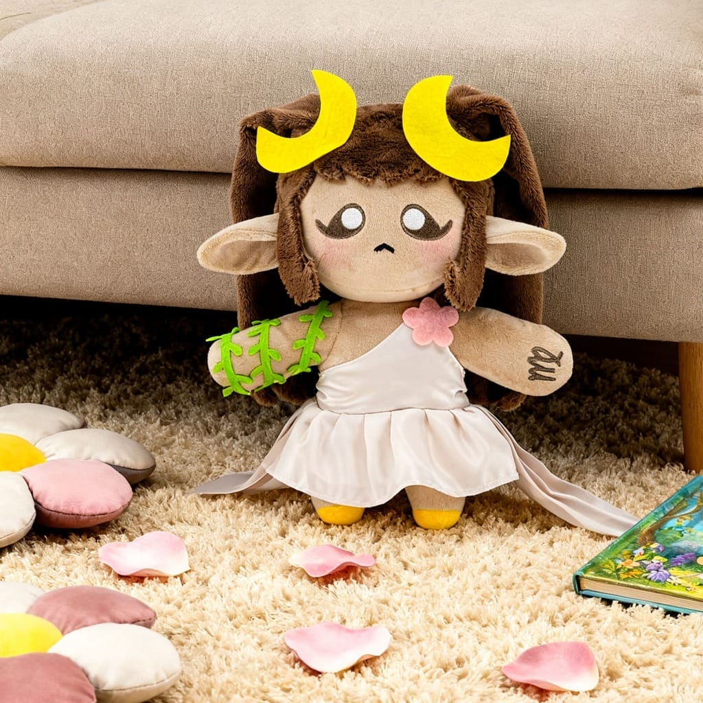 The Elf Plush Doll’s charm shines through its fairy-tale-inspired design details. Atop fluffy brown hair sit bright yellow crescent horns, a playful nod to its elf theme. Green vine decorations wrap gently around one arm, adding enchanted forest flair. Tiny pink wings peek out from behind its flowing white dress—subtle enough to feel whimsical without being over-the-top. Every element works to make this Elf Plush Doll feel unique and full of personality.