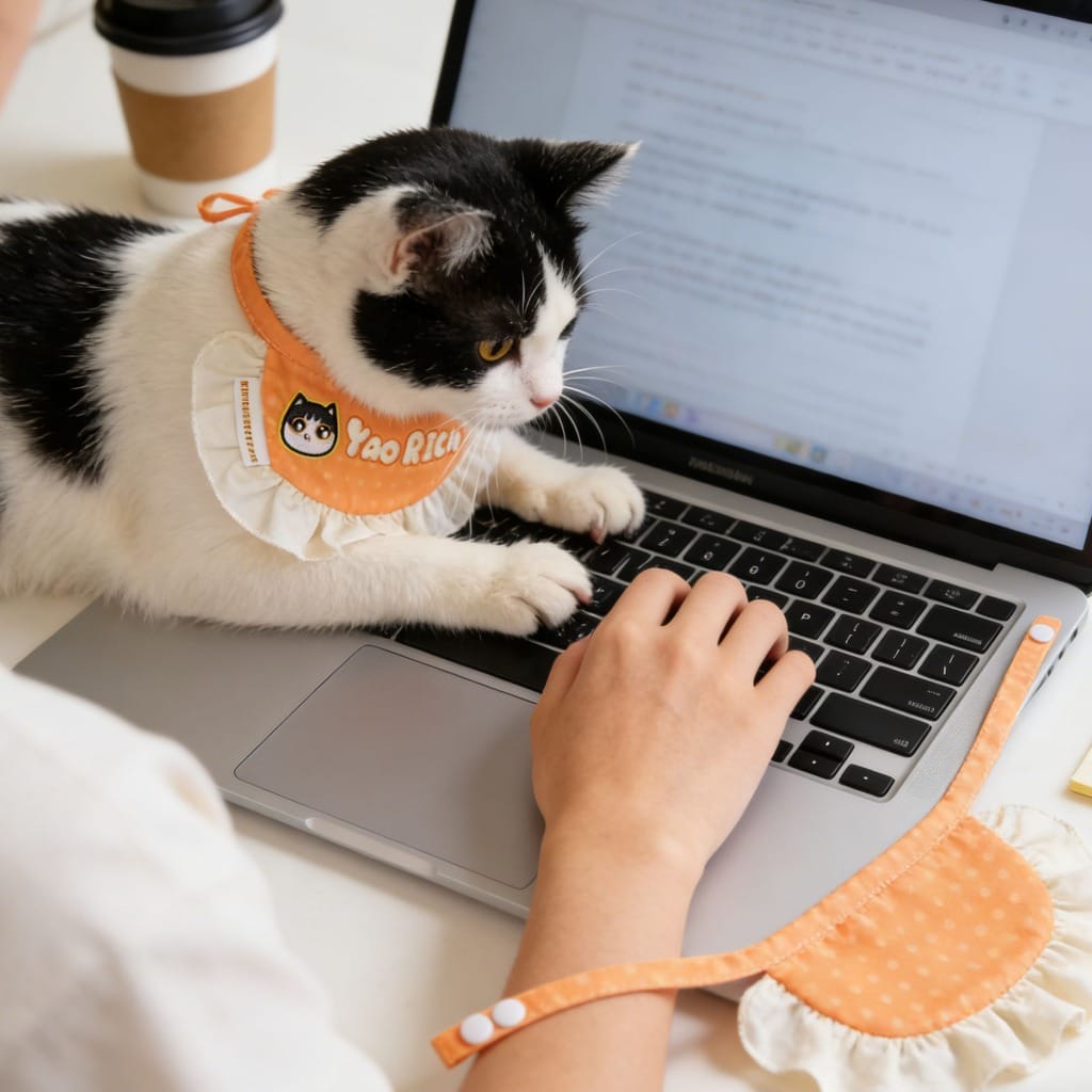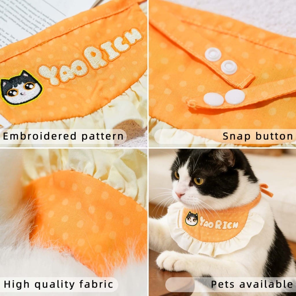 A custom pet bandana turns your cat or dog into a tiny fashion icon. The bright orange, polka-dot design with “YAO RICH” embroidery and a cute cat patch adds a playful, personalized touch. Whether your pet is posing for photos or lounging at home, this custom pet bandana makes them stand out in the best way. It’s a small detail that reflects both your pet’s vibe and your unique taste.